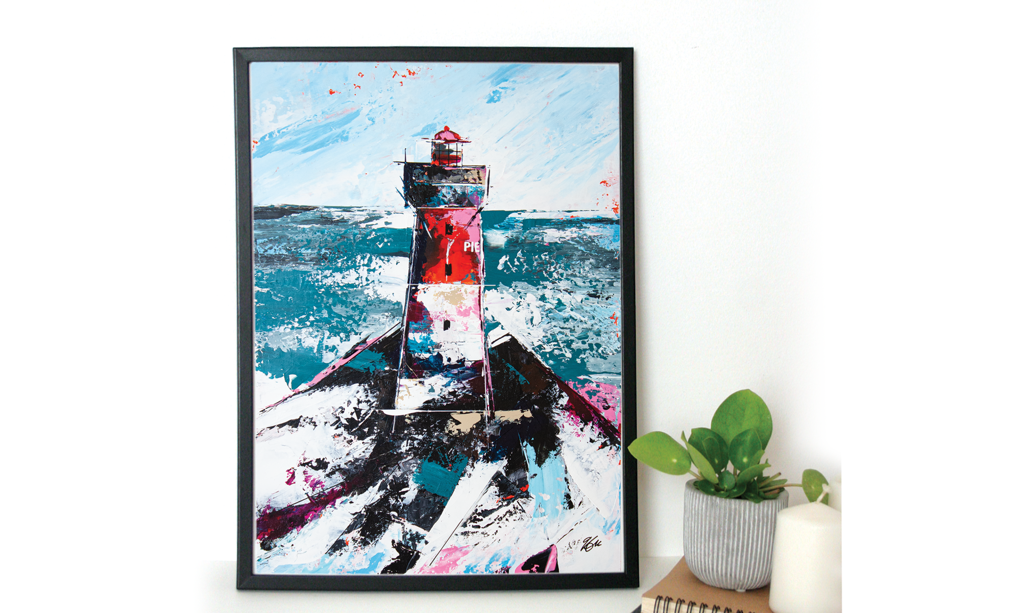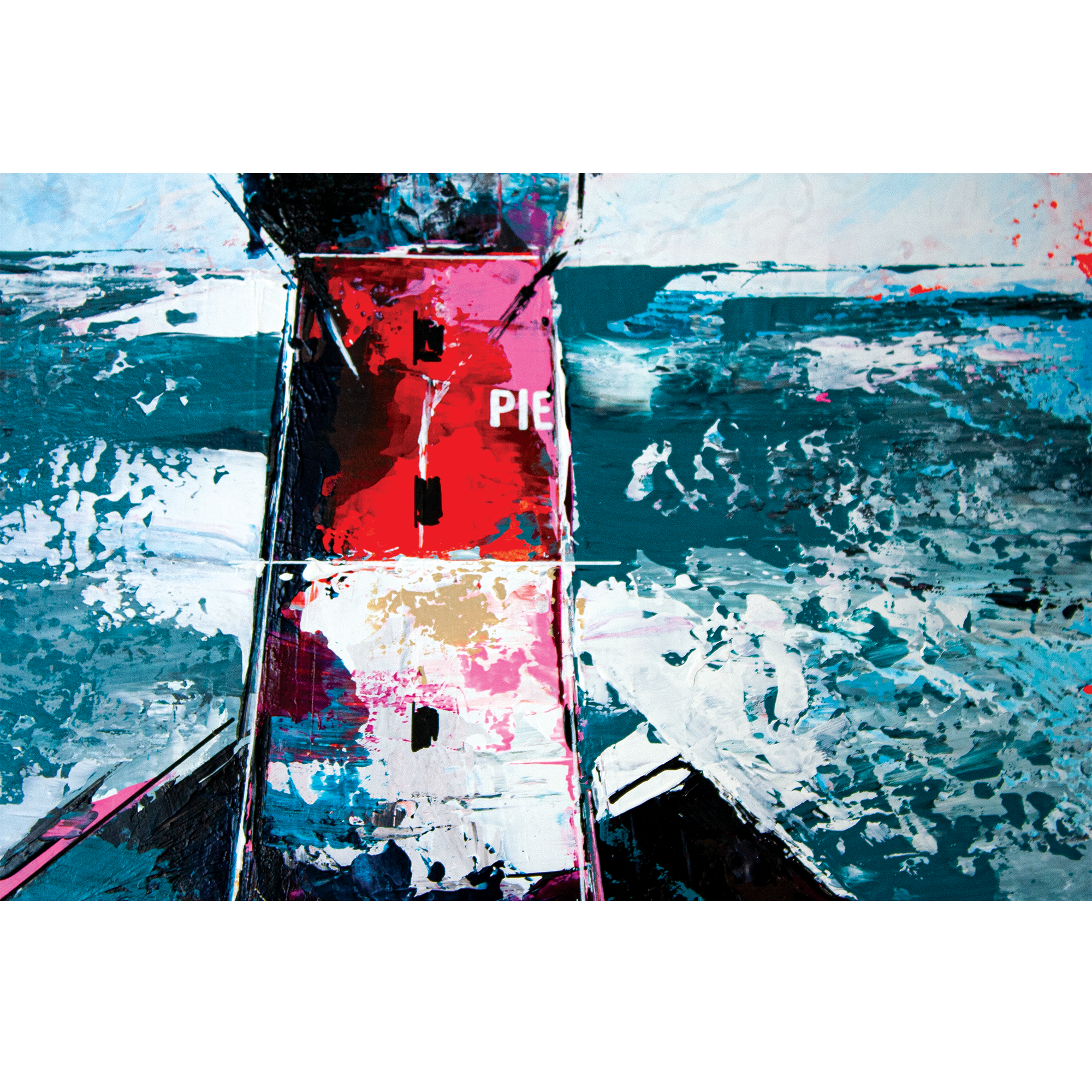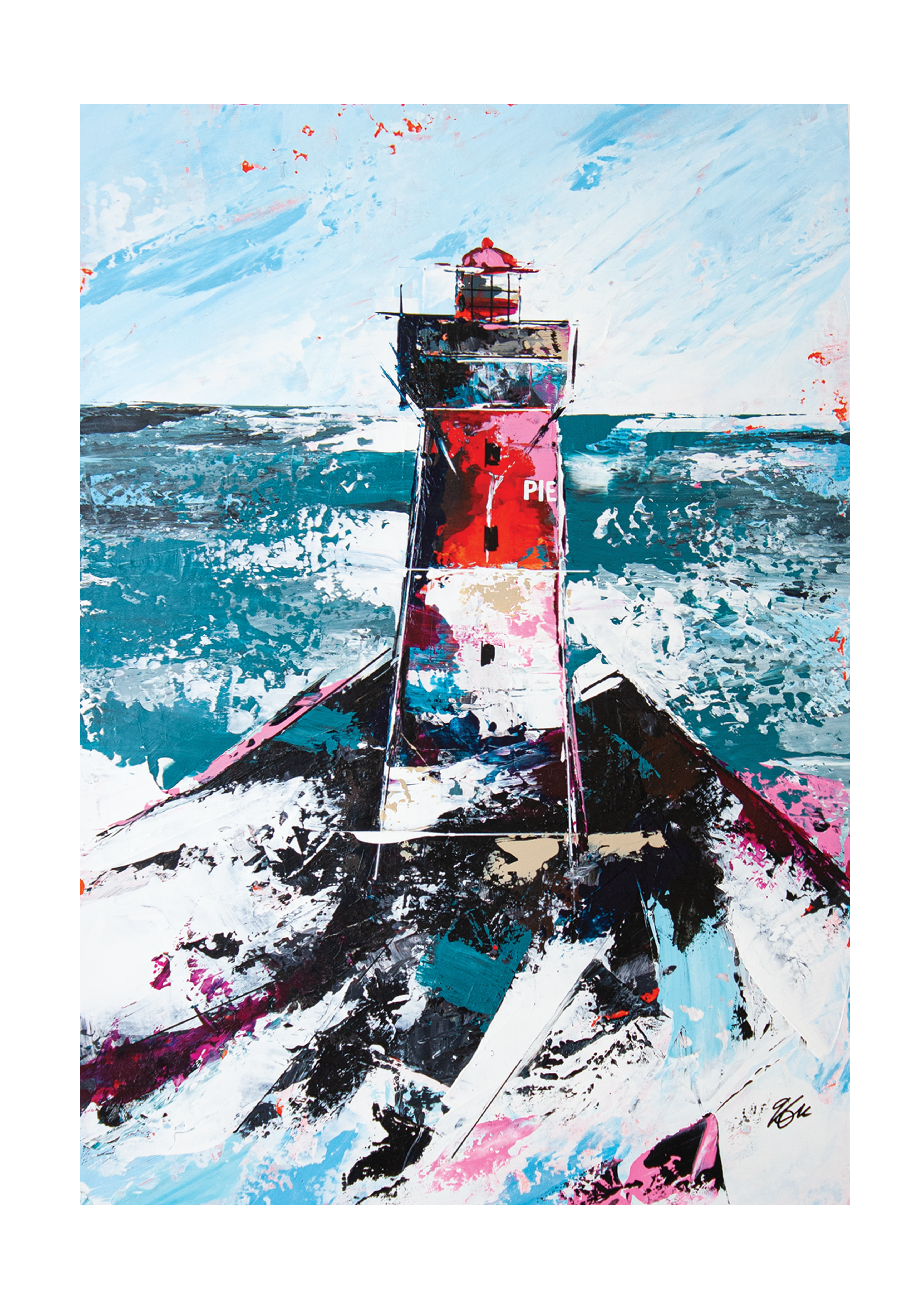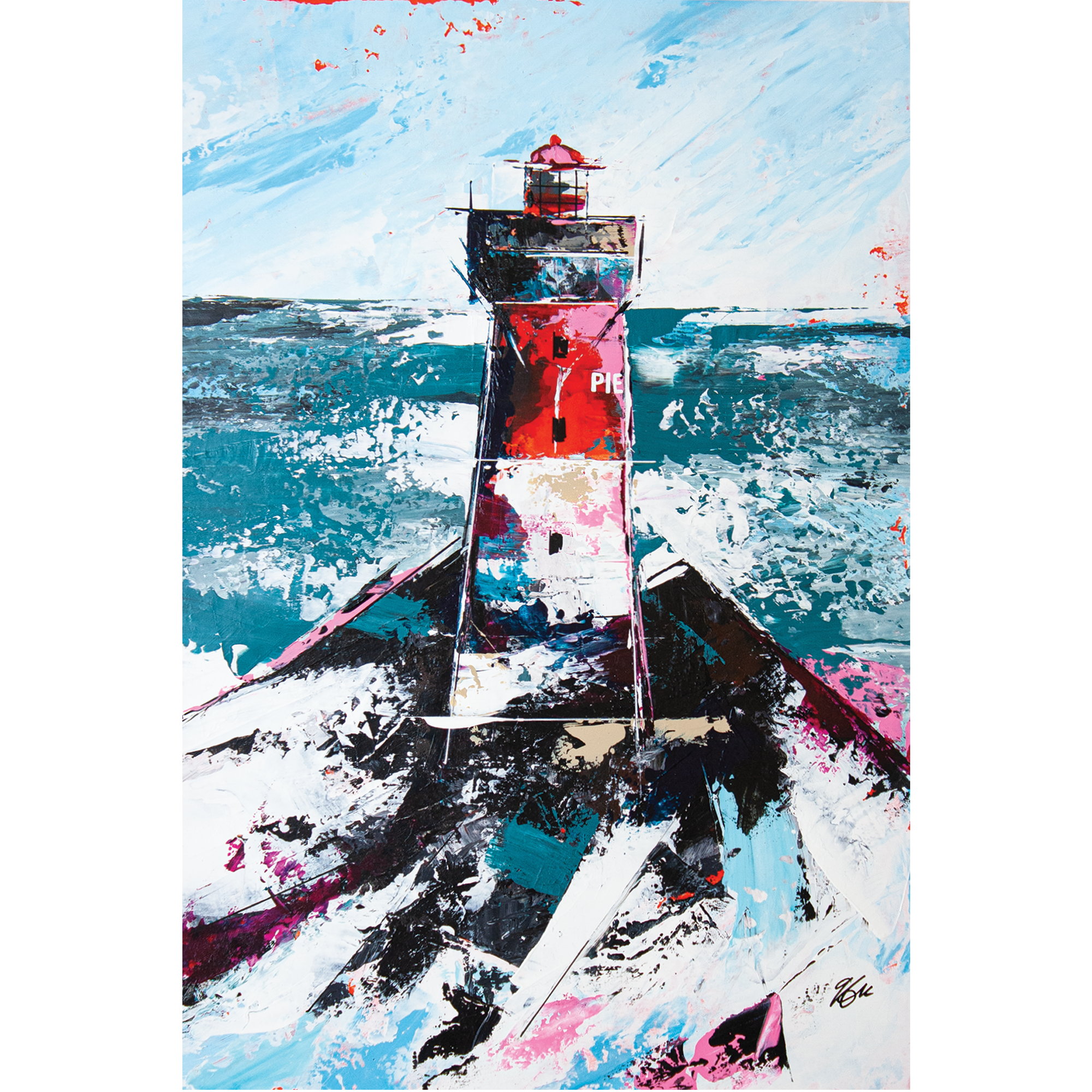 Peinte à l’acrylique sur papier 300g, l’œuvre est texturée, lumineuse et évocatrice, illustrant la beauté sauvage et la puissance maritime de cette région. Les coups de couteaux dynamiques et les nuances de bleu gris avec le contraste rouge reflètent l’atmosphère unique des paysages bretons.