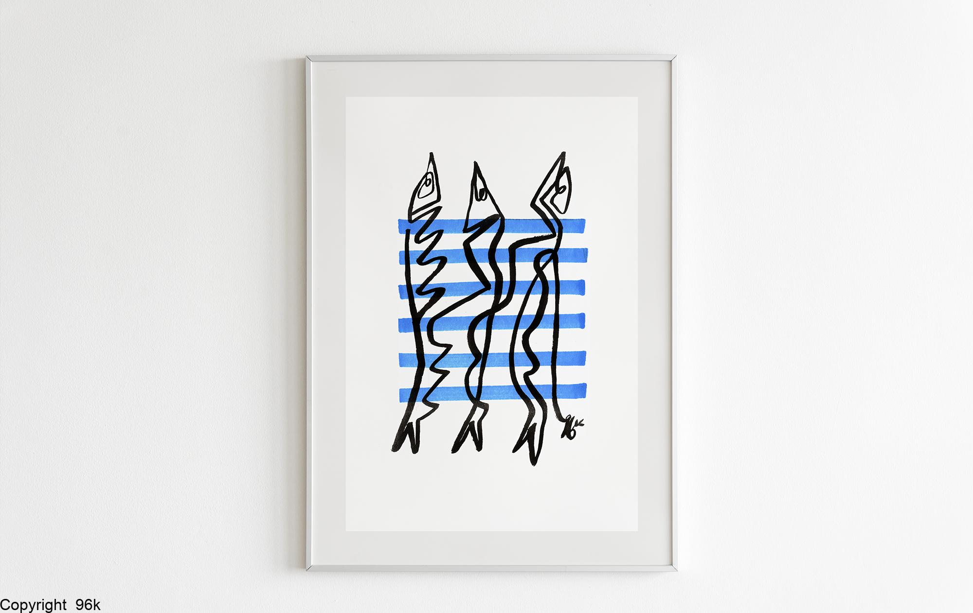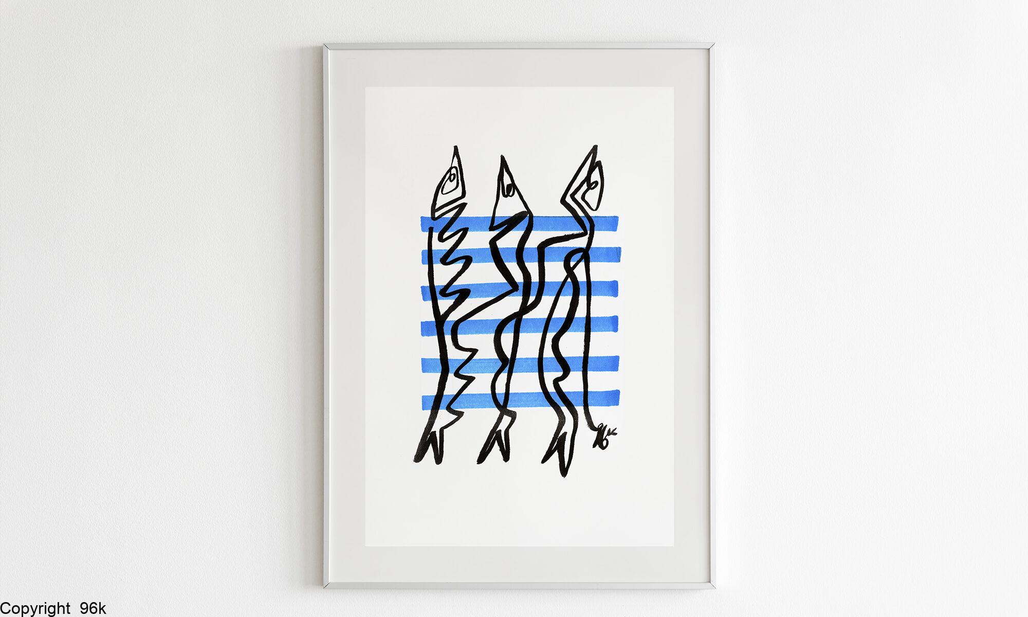 Une seule ligne, sans lever le pinceau, à l’encre de Chine et ligne bleue faite au marker. Imprimé sur du papier 300g Premium.
