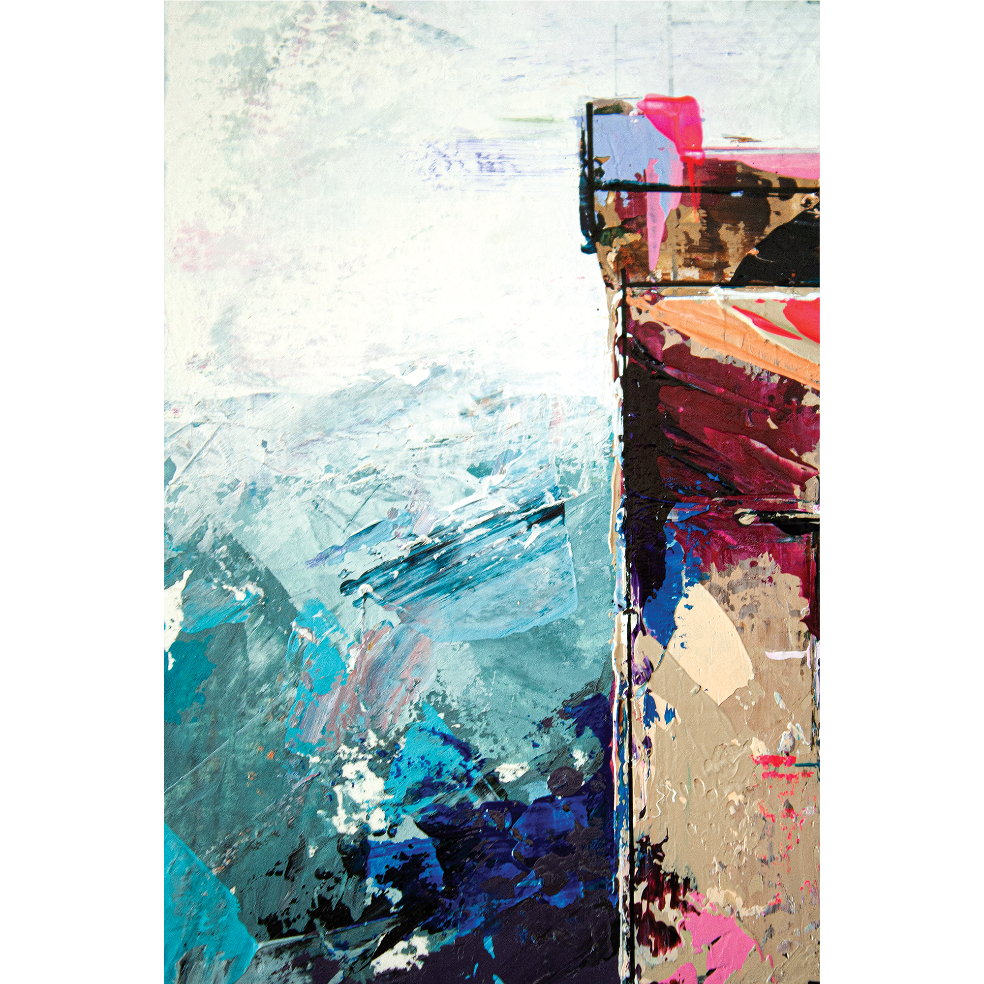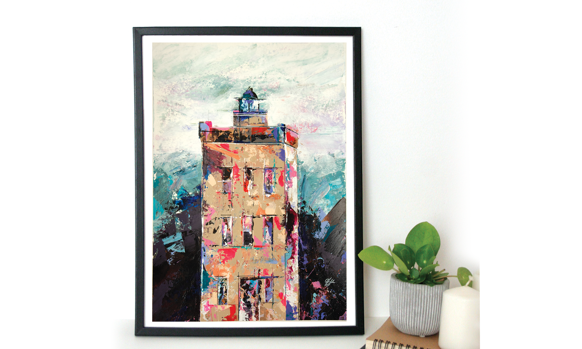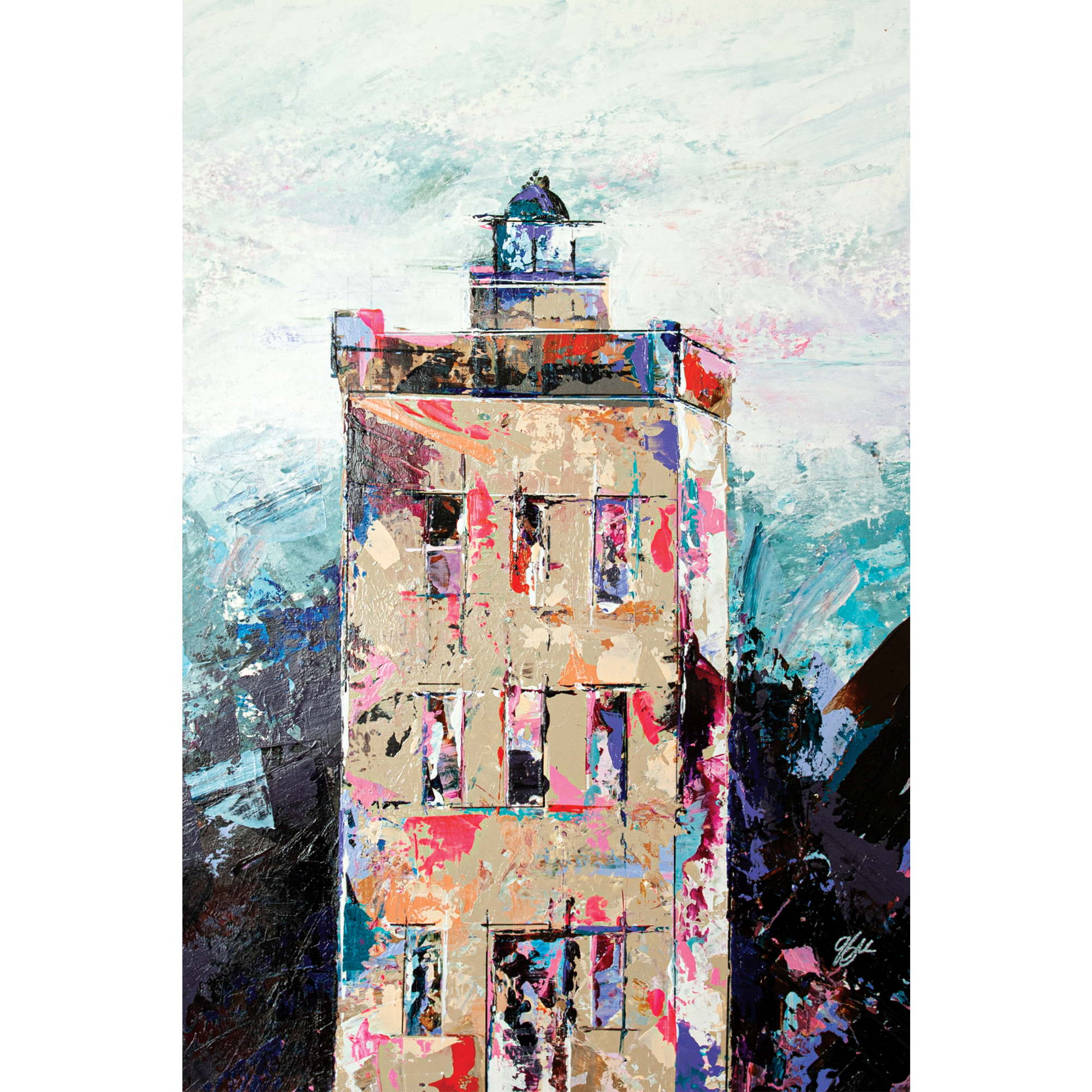 Peinte à l’acrylique sur papier 300g, l’œuvre est texturée, lumineuse et évocatrice, illustrant la beauté sauvage et la puissance maritime de cette région. Les coups de couteaux dynamiques et les nuances de bleu gris avec le contraste rouge reflètent l’atmosphère unique des paysages bretons.