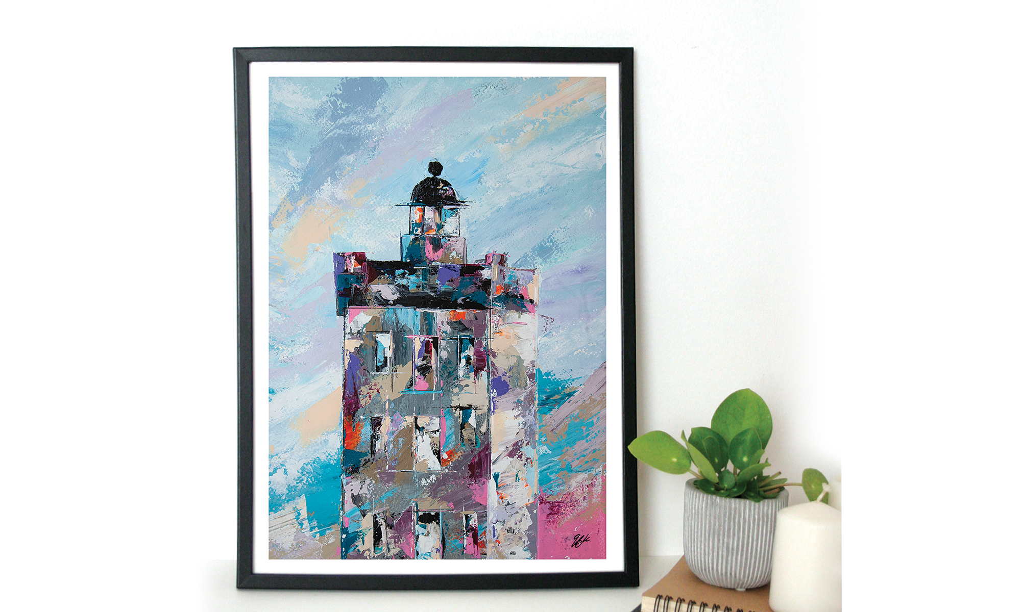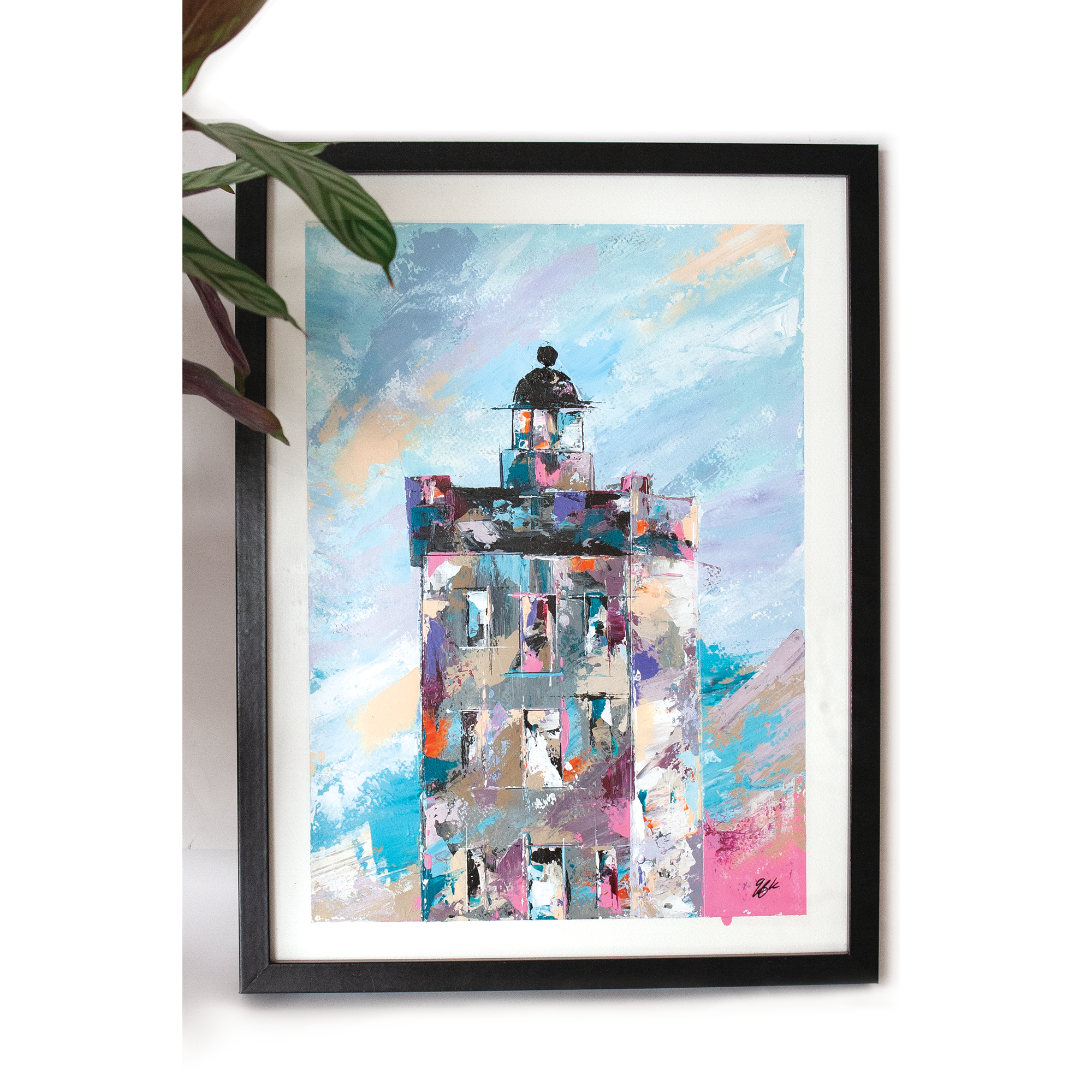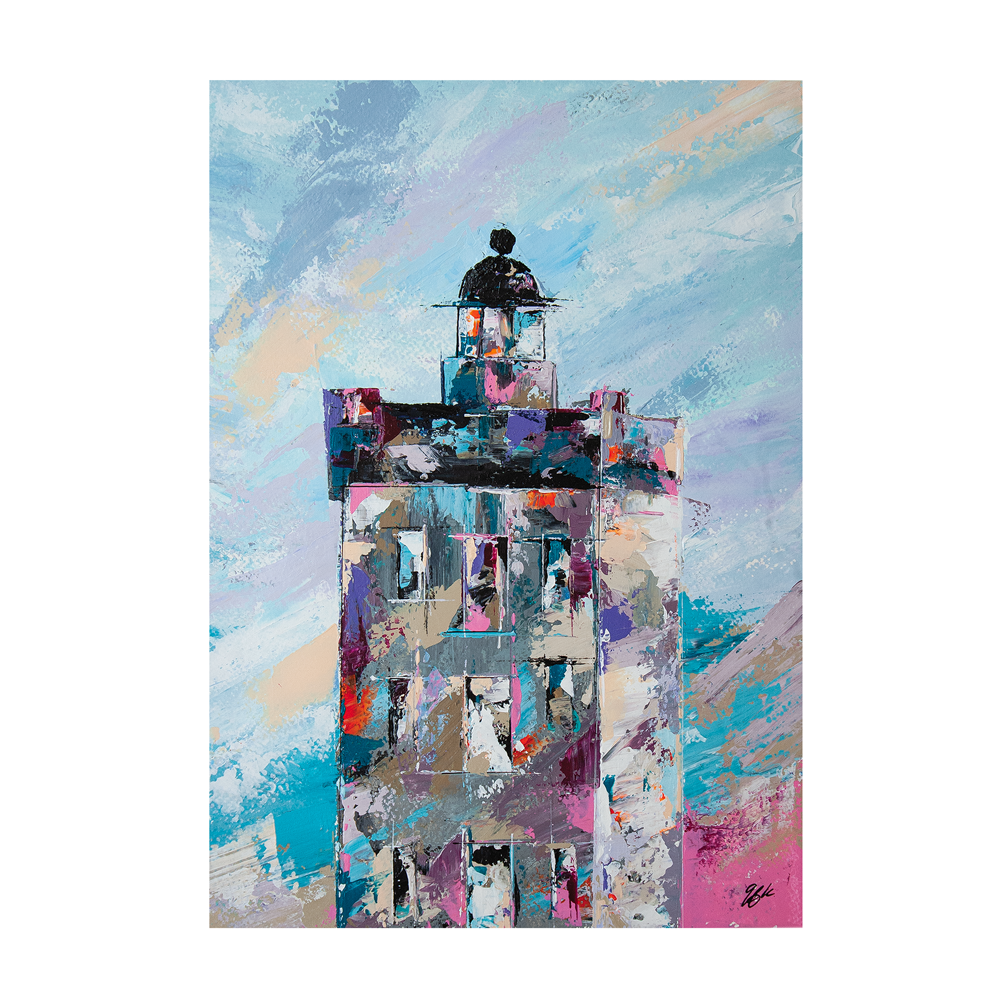 Peinte à l’acrylique sur papier 300g, l’œuvre est texturée, lumineuse et évocatrice, illustrant la beauté sauvage et la puissance maritime de cette région. Les coups de couteaux dynamiques et les nuances de bleu gris avec le contraste rouge reflètent l’atmosphère unique des paysages bretons.