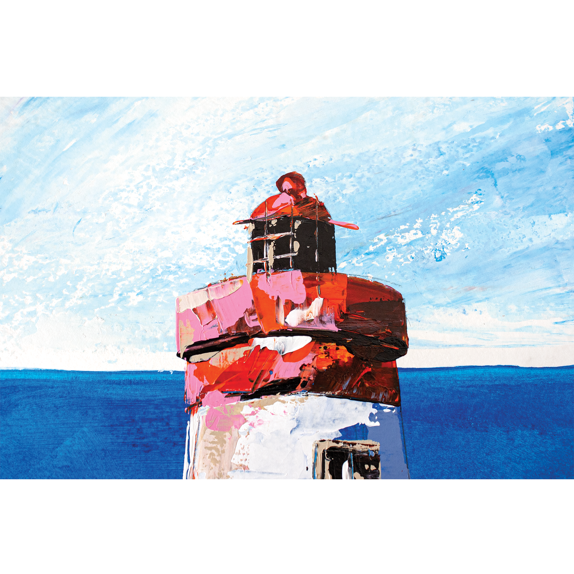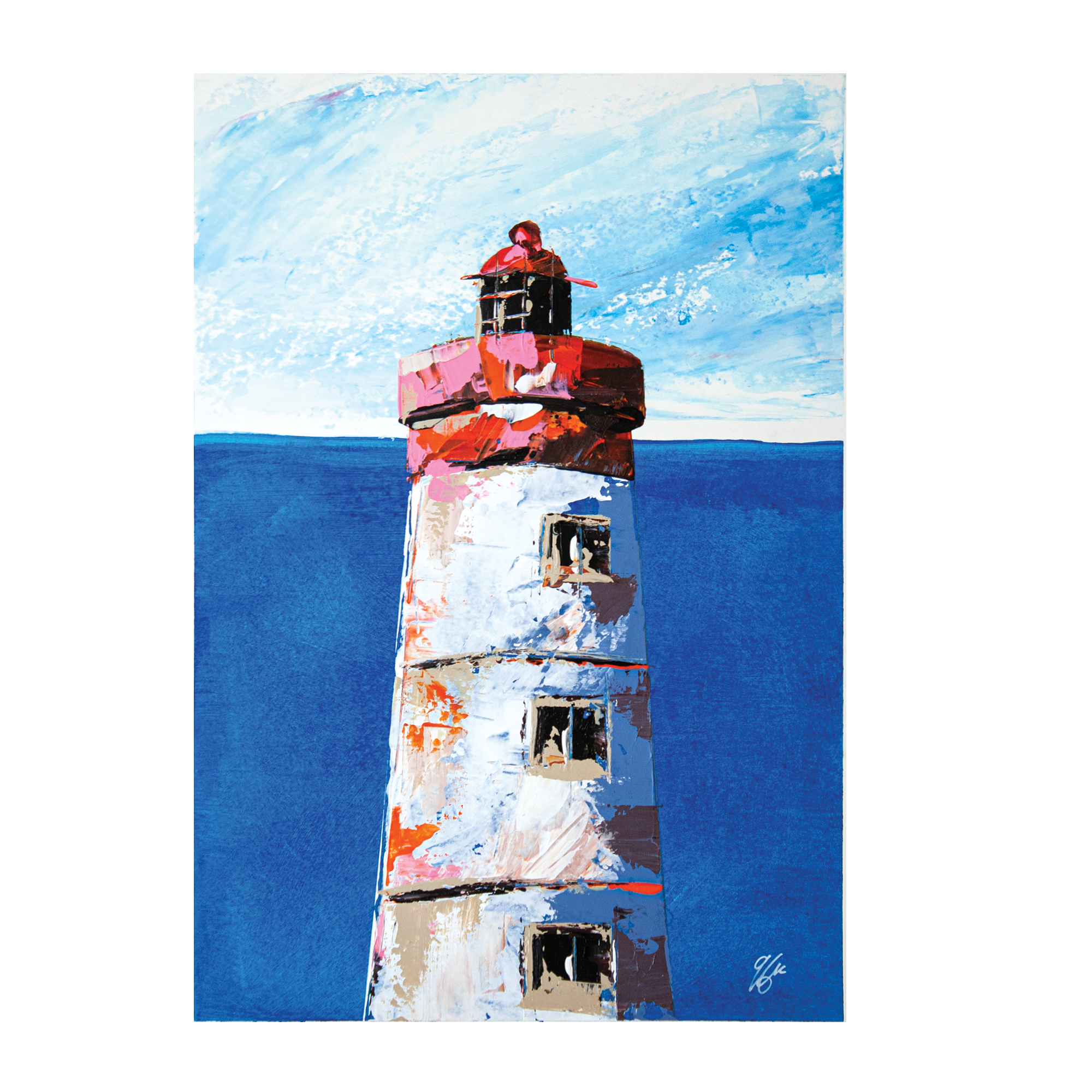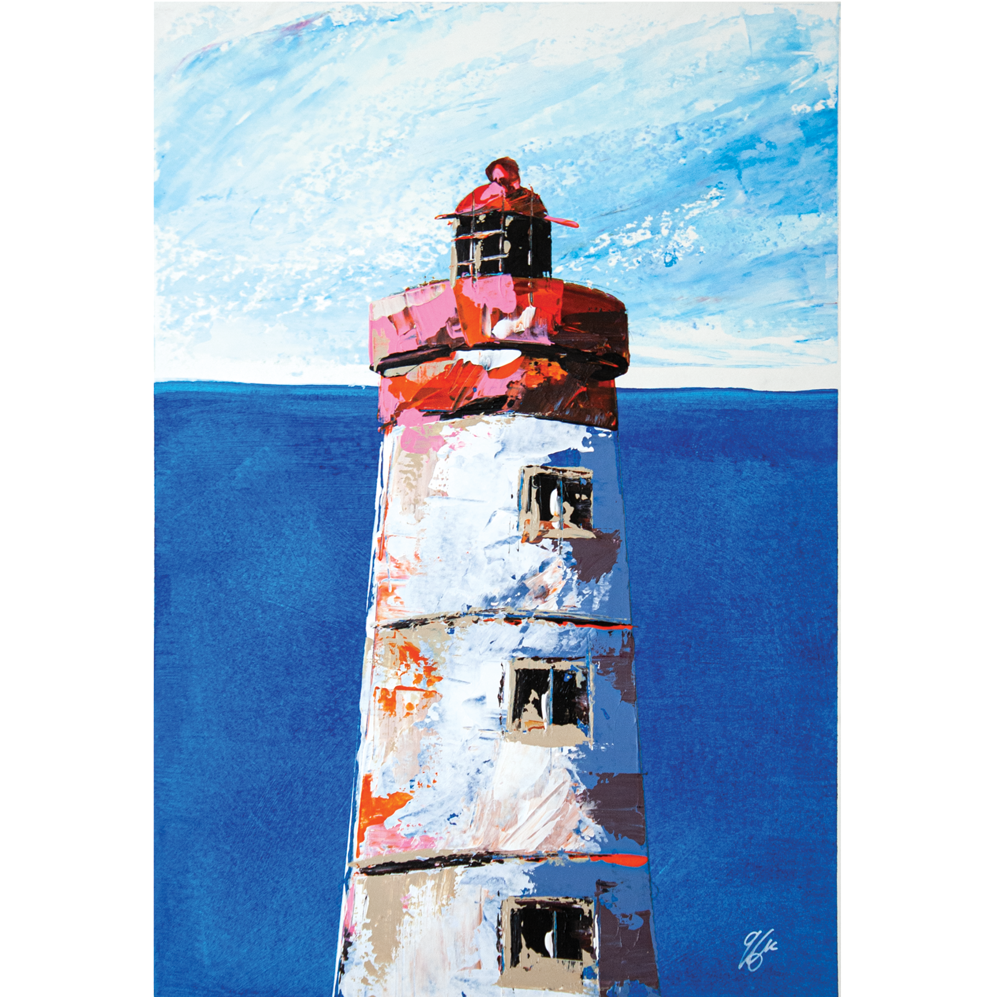 Peinte à l’acrylique sur papier 300g, l’œuvre est texturée, lumineuse et évocatrice, illustrant la beauté sauvage et la puissance maritime de cette région. Les coups de couteaux dynamiques et les nuances de bleu gris avec le contraste rouge reflètent l’atmosphère unique des paysages bretons.