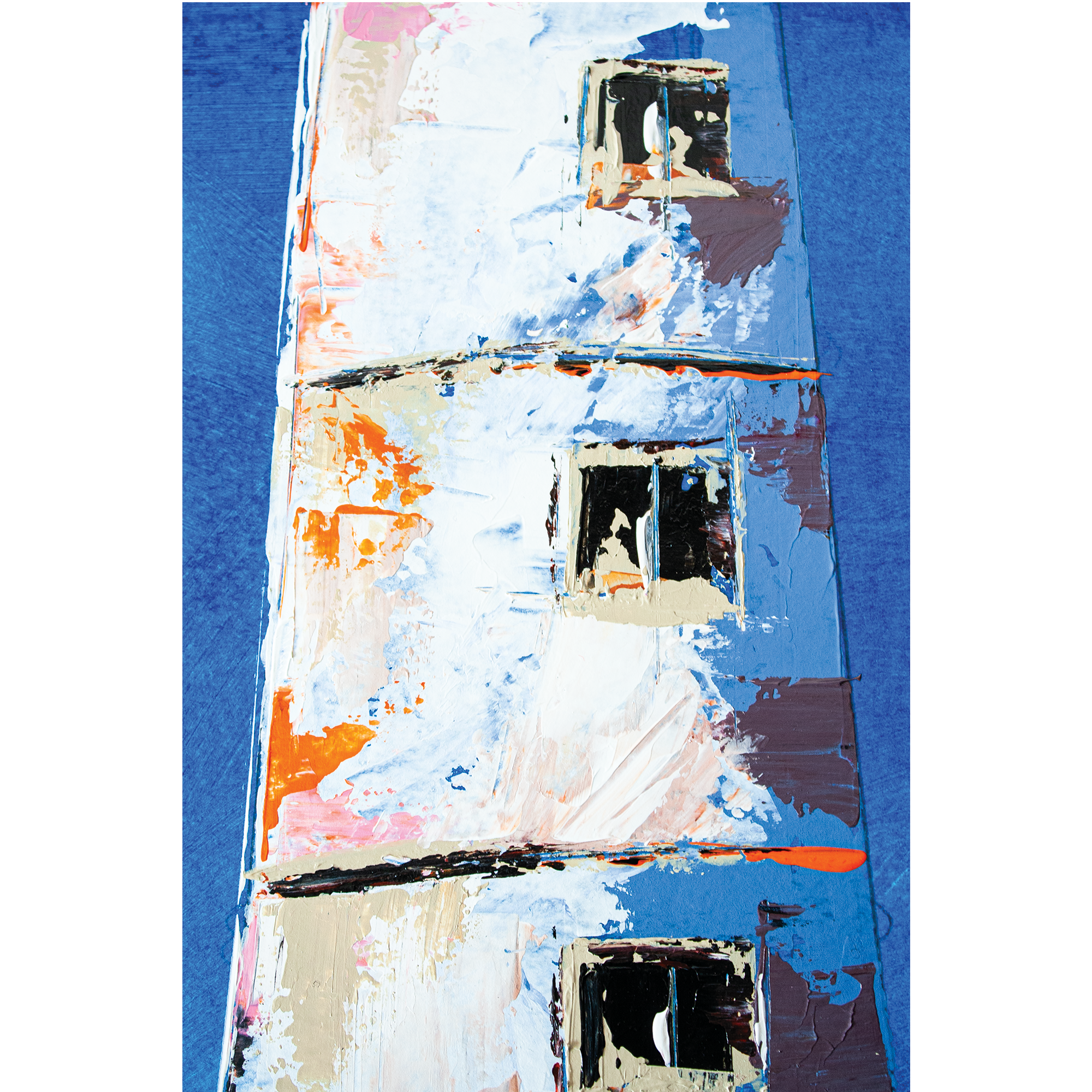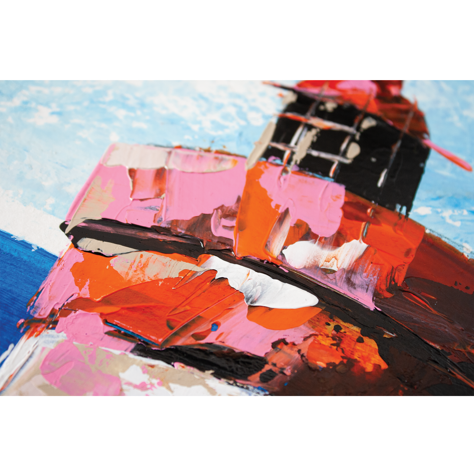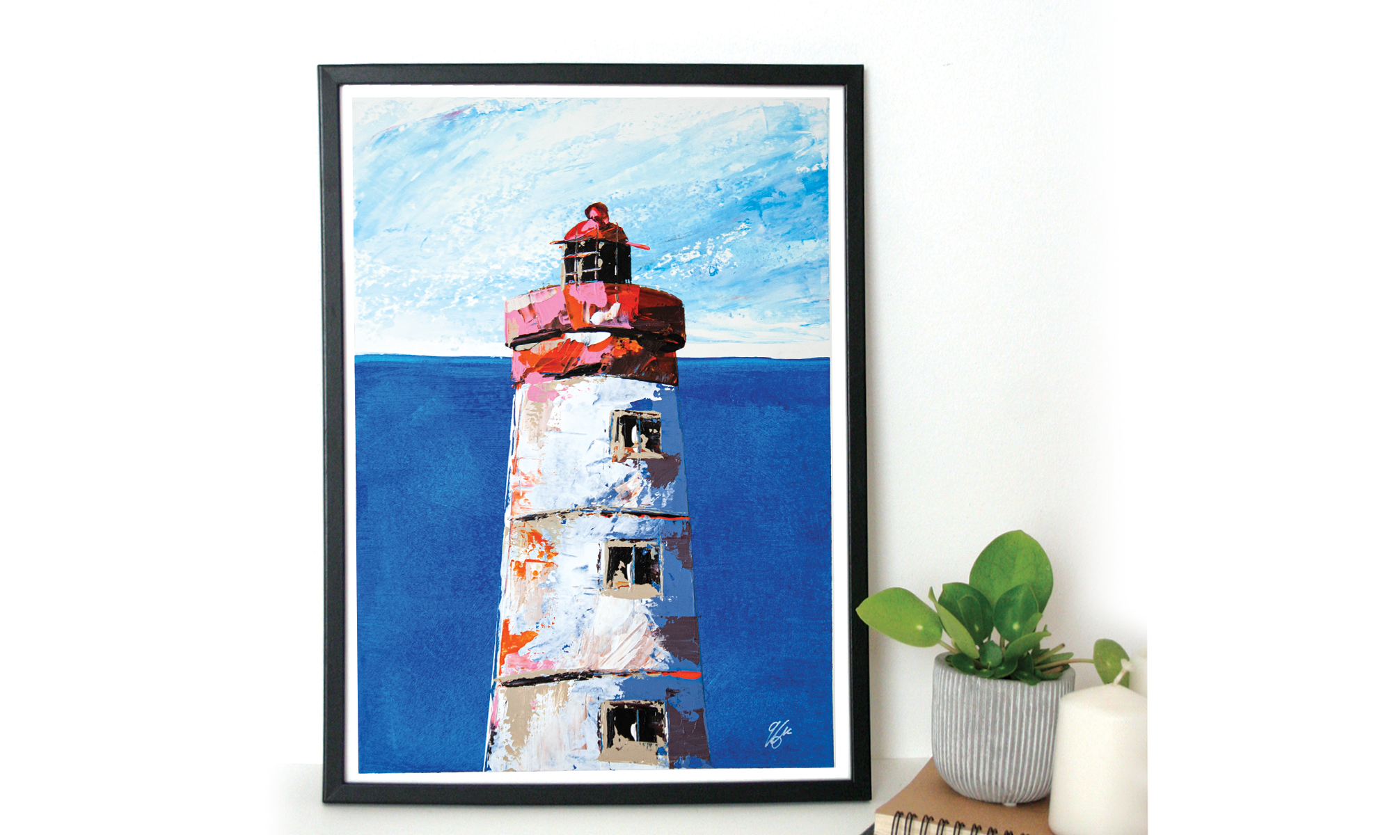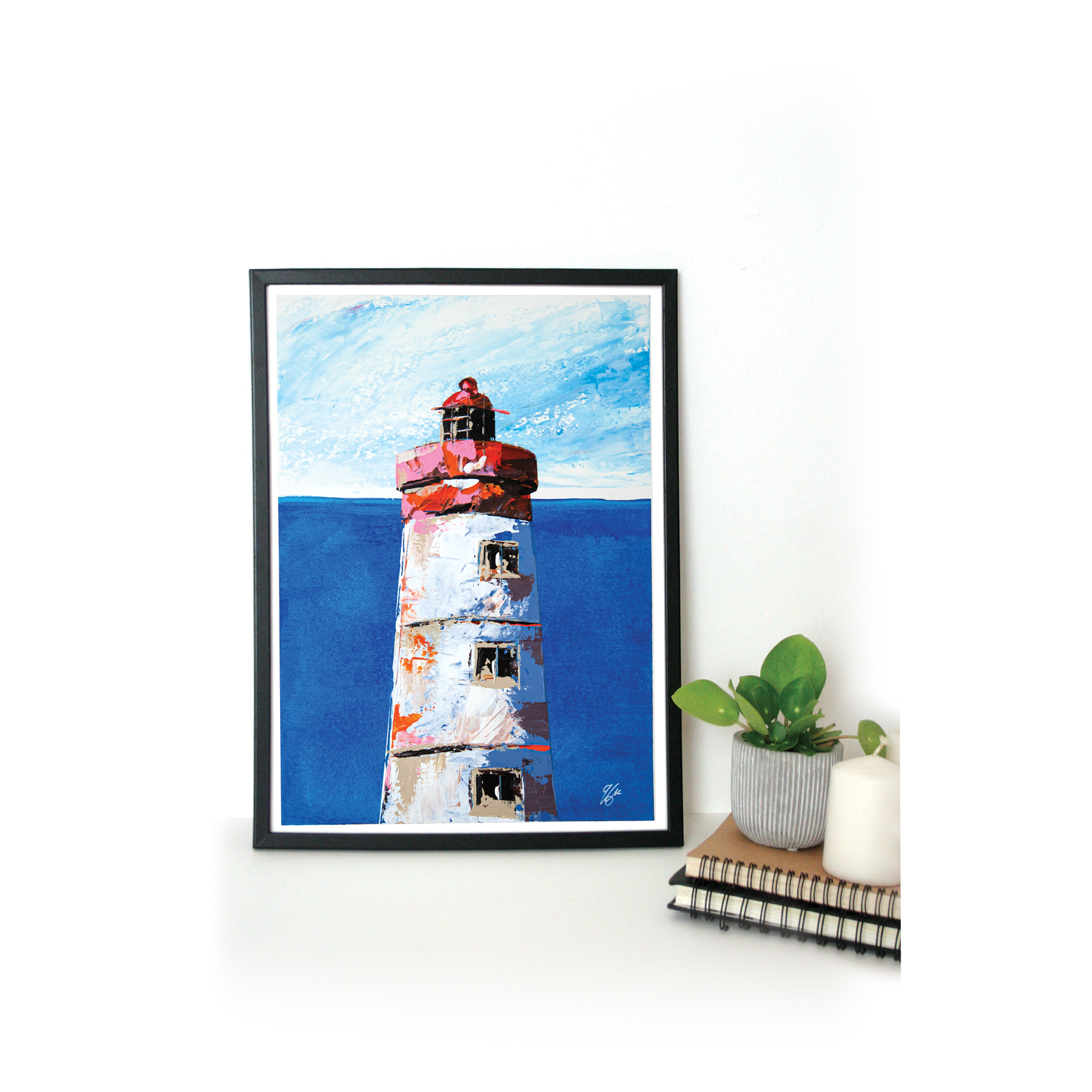 Peinte à l’acrylique sur papier 300g, l’œuvre est texturée, lumineuse et évocatrice, illustrant la beauté sauvage et la puissance maritime de cette région. Les coups de couteaux dynamiques et les nuances de bleu gris avec le contraste rouge reflètent l’atmosphère unique des paysages bretons.