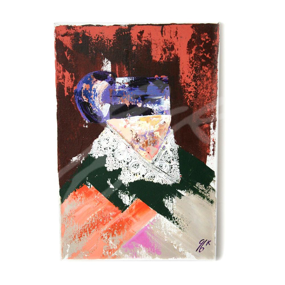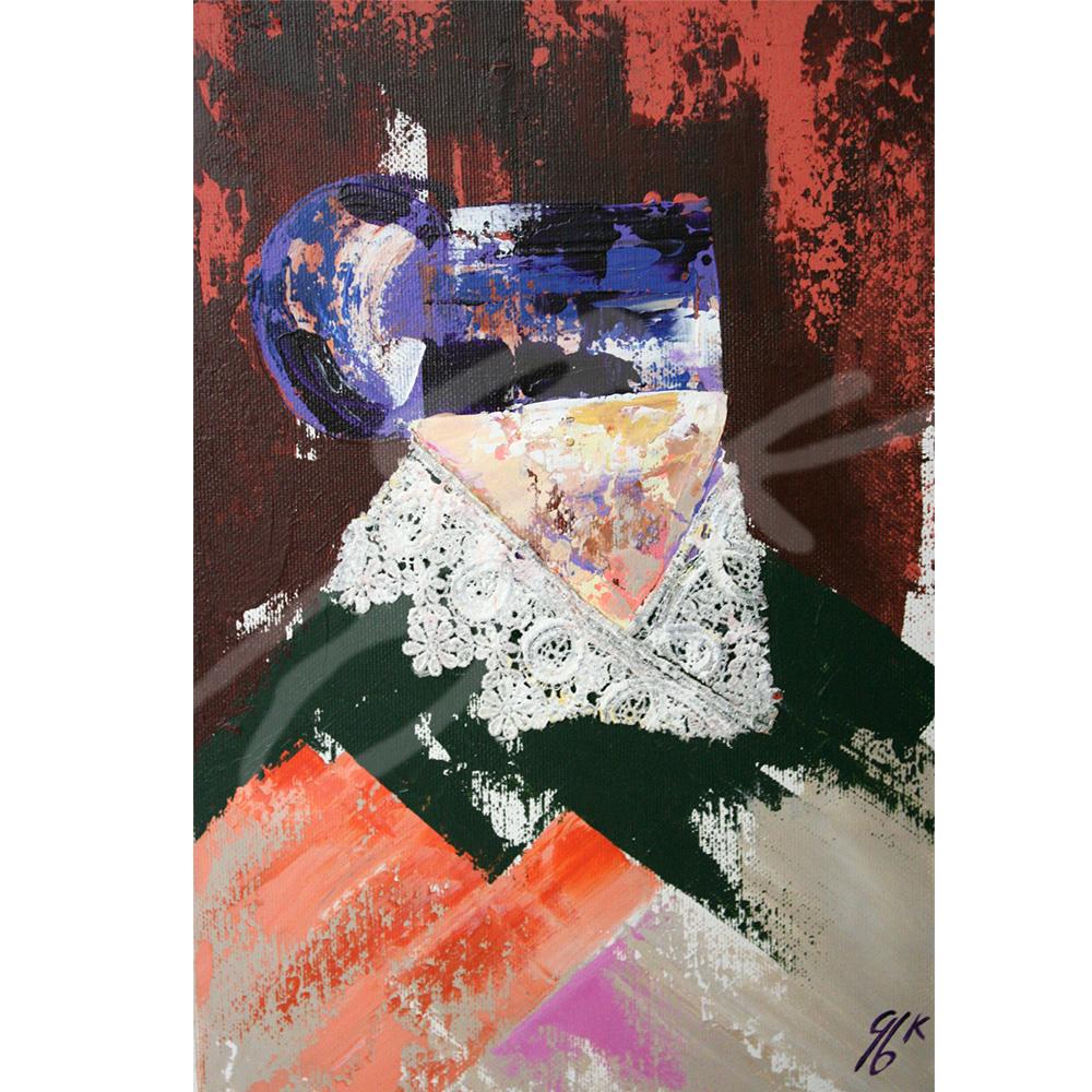Je l’ai peinte à l’acrylique et au couteau sur un toile entoilé de 20×30 cm. Avec applic d’un detail de vrai dentelle. L’œuvre est texturée, colorée et vivante, mettant en lumière l’élégance et la richesse culturelle de cette tradition.